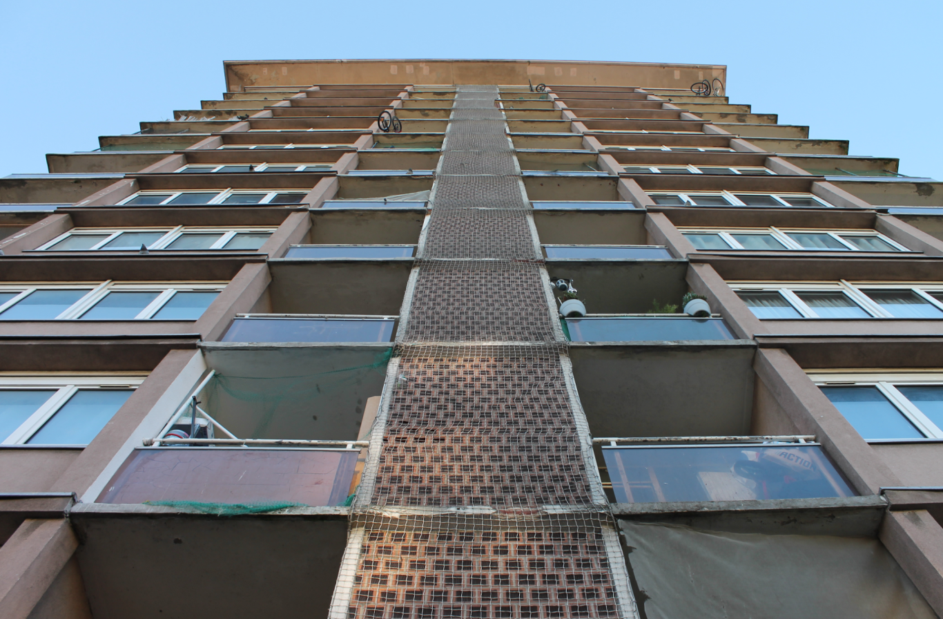 La tour, qui présentait une détérioration avancée, notamment au niveau des dalles de balcons et des loggias, est traitée avec une attention particulière. Les garde-corps et occultations existantes sont intégralement remplacés par des éléments de serrureries en tôle perforée qui permettent à la fois d'assurer la sécurité des locataires, mais également de favoriser la pérennité de l'édifice en habillant les nez de dalles. L'ensemble de ces éléments de serrurerie présente une perforation de densité variable afin de garantir une intimité optimale aux locataires tout en conservant l'apport lumineux.