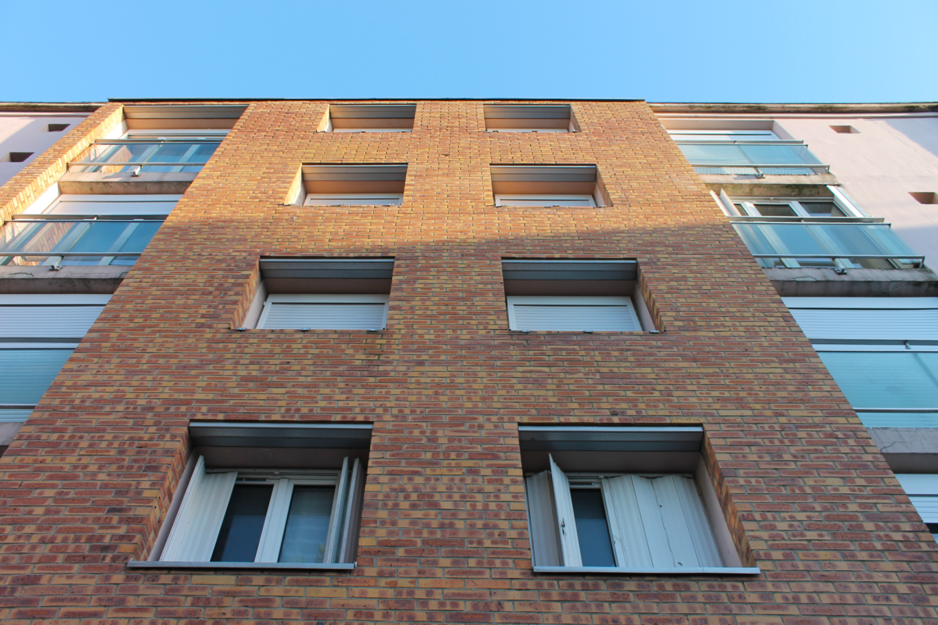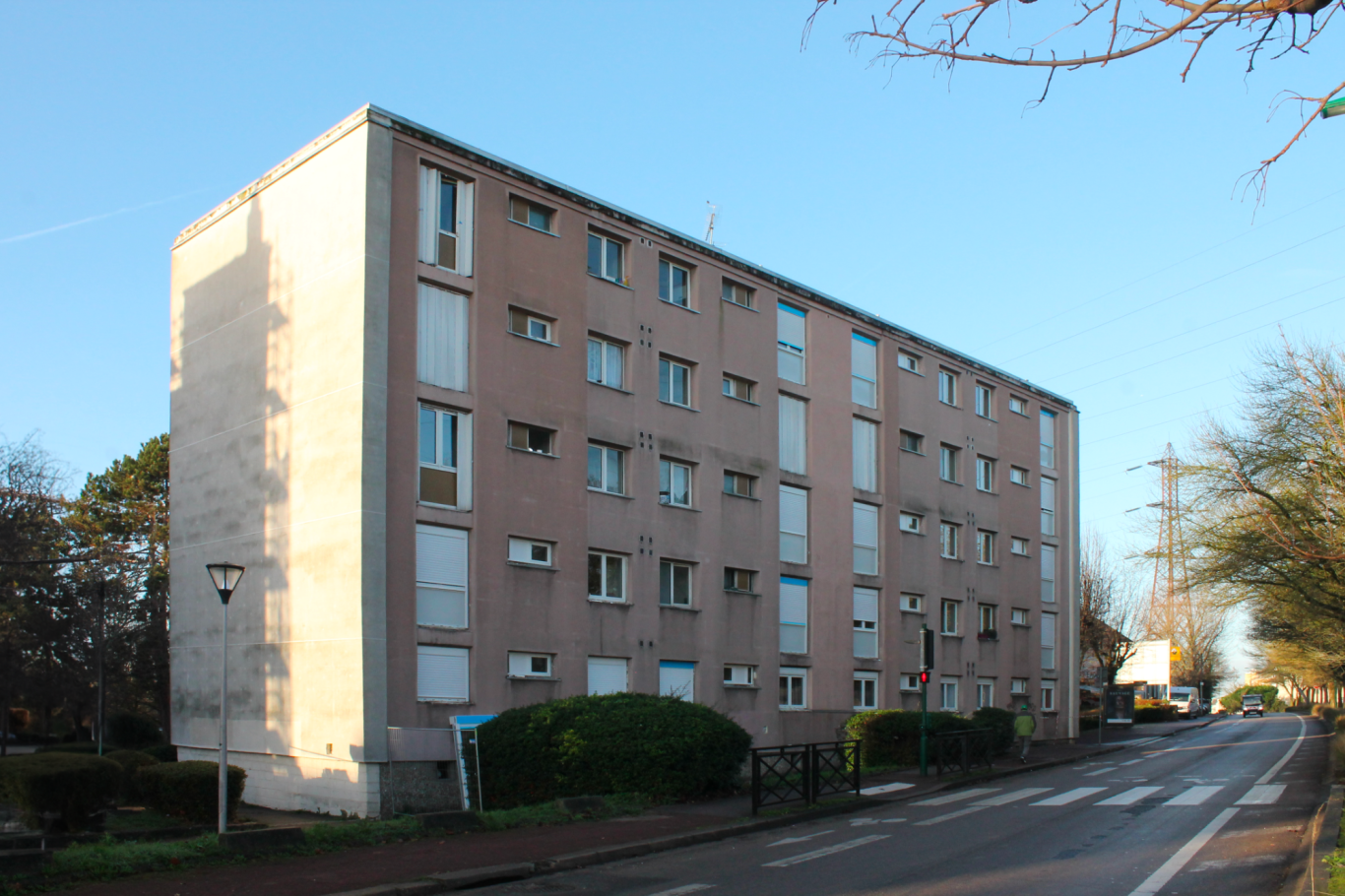 L'ensemble, très représentatif de son époque de construction, constitue aujourd'hui un patrimoine vétuste et peu adapté aux exigences contemporaines. L'écriture architecturale est très lisse et peu rythmée. Malgré le fait qu'elle confère à l'ensemble, une grande homogénéité, elle véhicule une image austère et peu accueillante. Les façades Sud et Est donnant accès aux bâtiments, présentent des habillages en briques rapportées correspondant à des travaux d'amélioration de l'isolation. L'opération prévoit une optimisation énergétique avec la mise en place d'un système d'isolation Thermique Extérieure. Le projet architectural se base à la fois sur les qualités existantes des bâtiments d'origine, mais également sur les éléments caractéristiques de la commune et du quartier pour proposer une image contemporaine dans le but de dé-stigmatiser le logement social. Certains éléments mis en avant par le dessin architectural original des façades, comme les circulations verticales, sont mis en valeur avec une attention particulière.